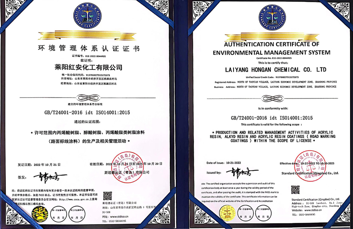 紅安化工經過近二十年的打造和積淀,現已建成了一家專業研制生產涂料合成樹脂的綜合型工廠,位于山東省半島的腹地--萊陽市。公司已通過了三體系認證,即ISO9000質量管理體系認證和環境、職業健康安全管理體系認證,并獲得了六項國家發明專利,八項實用新型專利;19年榮獲山東省高新企業稱號,22年通過了復審;22年榮獲山東省瞪羚企業稱謂,還有其他一些榮譽稱號不再一一敘說。 公司現有樹脂合成反應釜29套,各類樹脂年生產能力約8萬噸,具有完善的檢測儀器和應用服務條件。